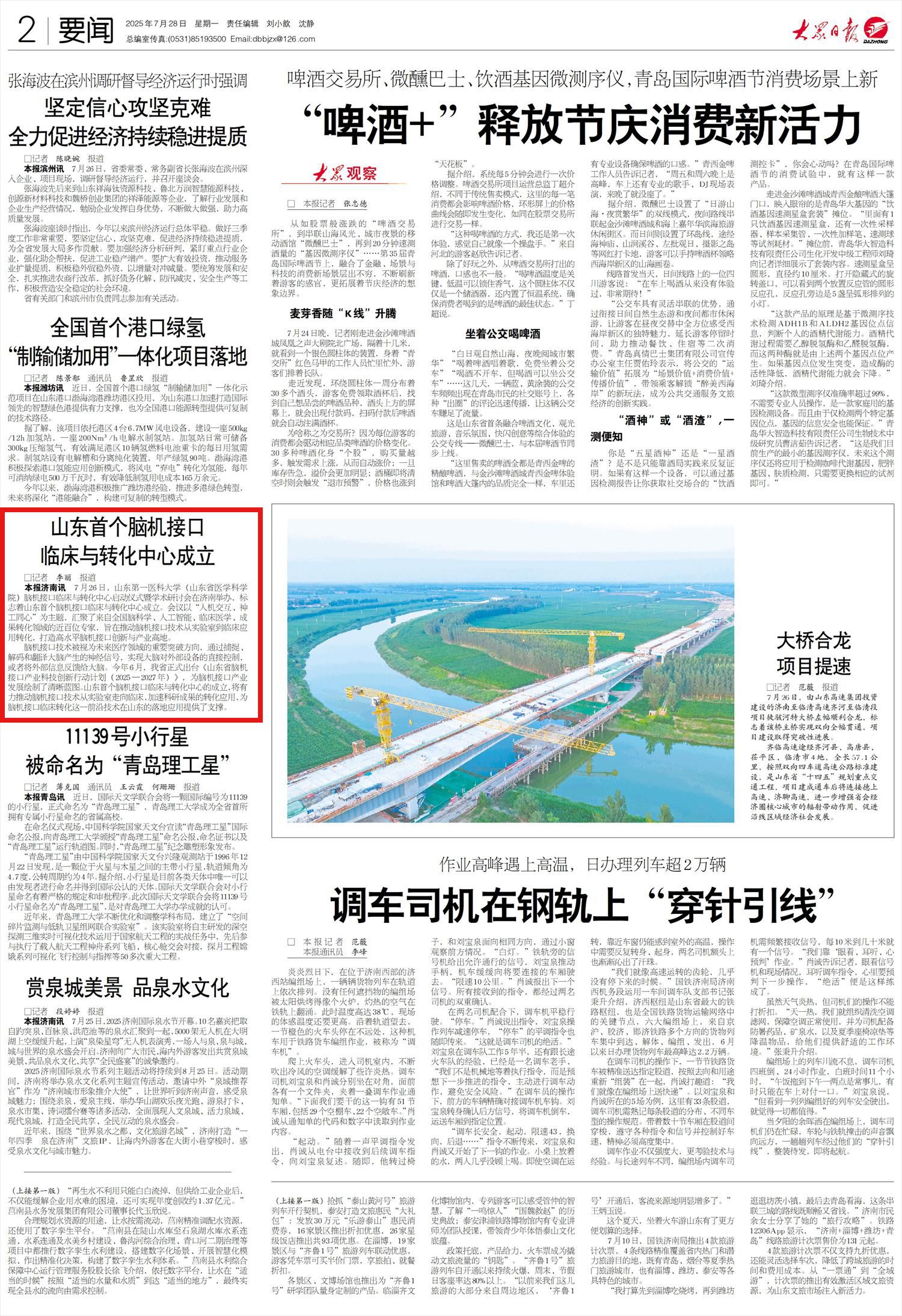 脑机接口技术被视为未来医疗领域的重要突破方向,通过捕捉、解码和翻译大脑产生的神经信号,实现大脑对外部设备的直接控制,或者将外部信息反馈给大脑。今年6月,我省正式出台《山东省脑机接口产业科技创新行动计划(2025—2027年)》,为脑机接口产业发展绘制了清晰蓝图。山东首个脑机接口临床与转化中心的成立,将有力推动脑机接口技术从实验室走向临床,加速科研成果的转化应用,为脑机接口临床转化这一前沿技术在山东的落地应用提供了支撑。