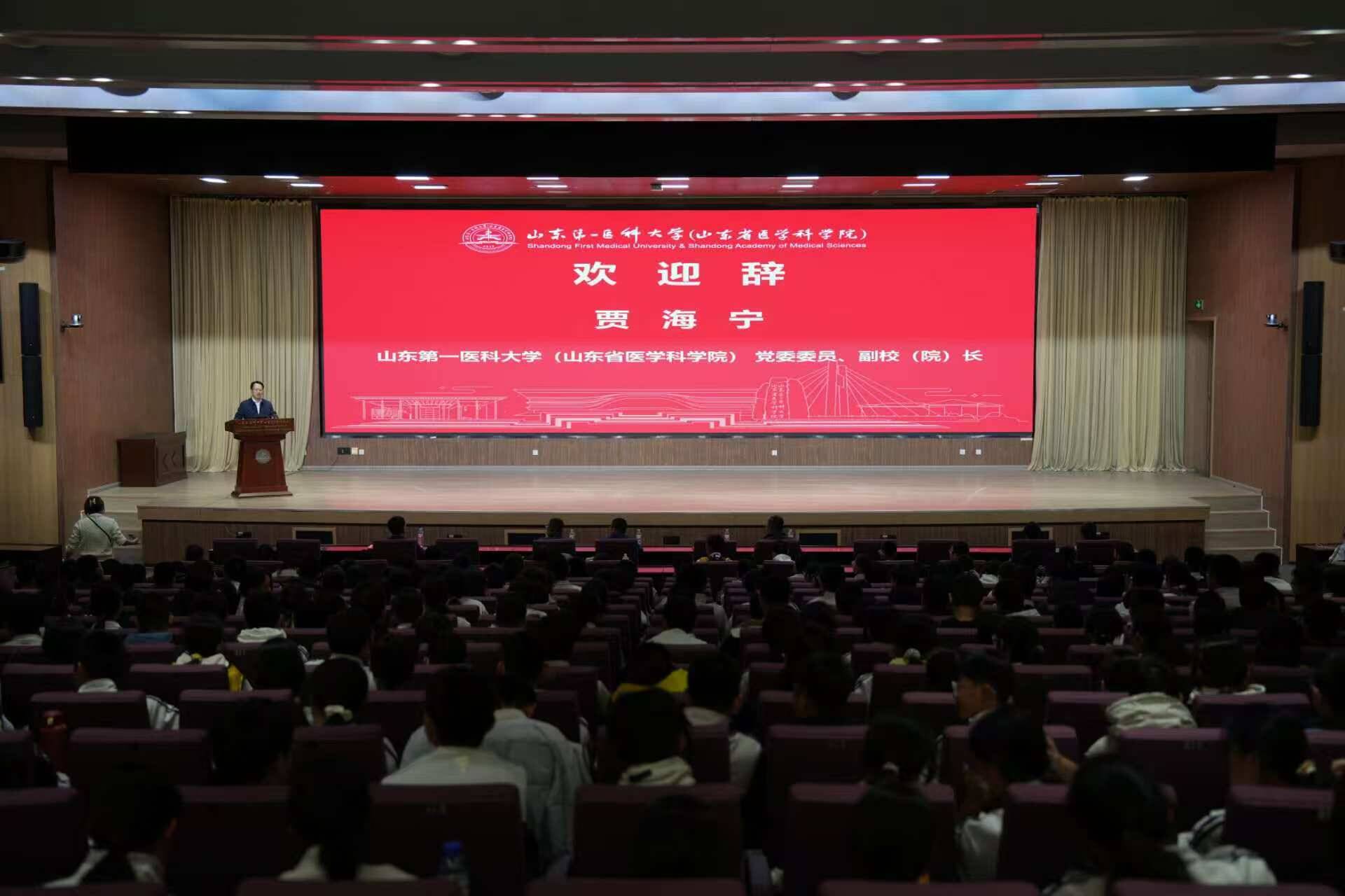 贾海宁在致辞中围绕“初心”“探索”“成长”三个关键词,向师生们介绍了校(院)在医学教育、科研创新和医疗服务等方面取得的显著成绩。他表示,校(院)作为山东省科教融合的医学高地,是同学们探索医学奥秘、实现人生理想的优质平台,希望同学们保持对生命的敬畏与好奇,以此次研学为契机点燃医学梦想。