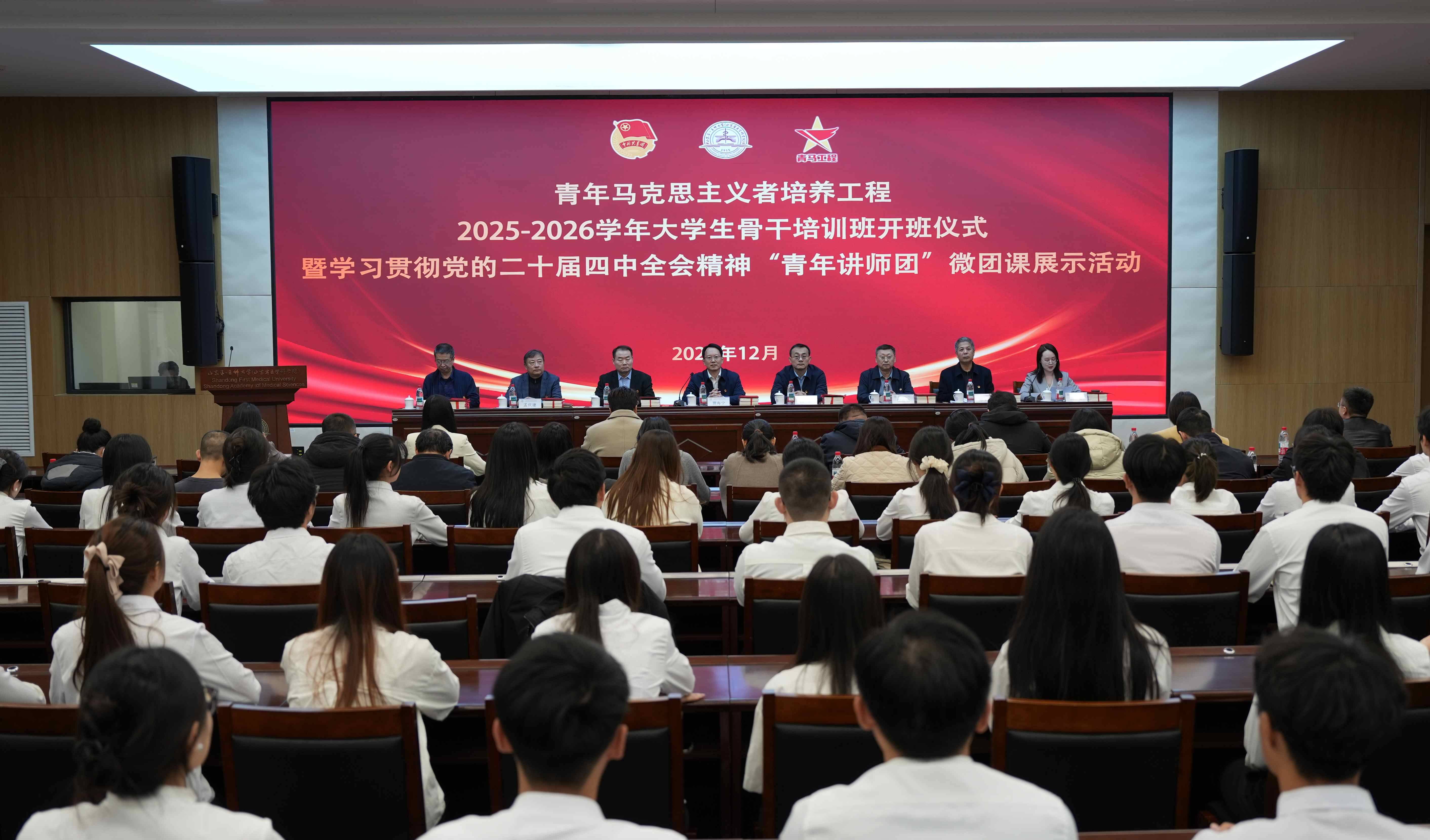 12月1日,校(院)青年马克思主义者培养工程2025-2026学年大学生骨干培训班开班仪式暨学习贯彻党的二十届四中全会精神“青年讲师团”微团课展示活动在济南校区举行。校(院)党委委员、副校(院)长贾海宁,党委委员、组织部部长闫栋出席会议。