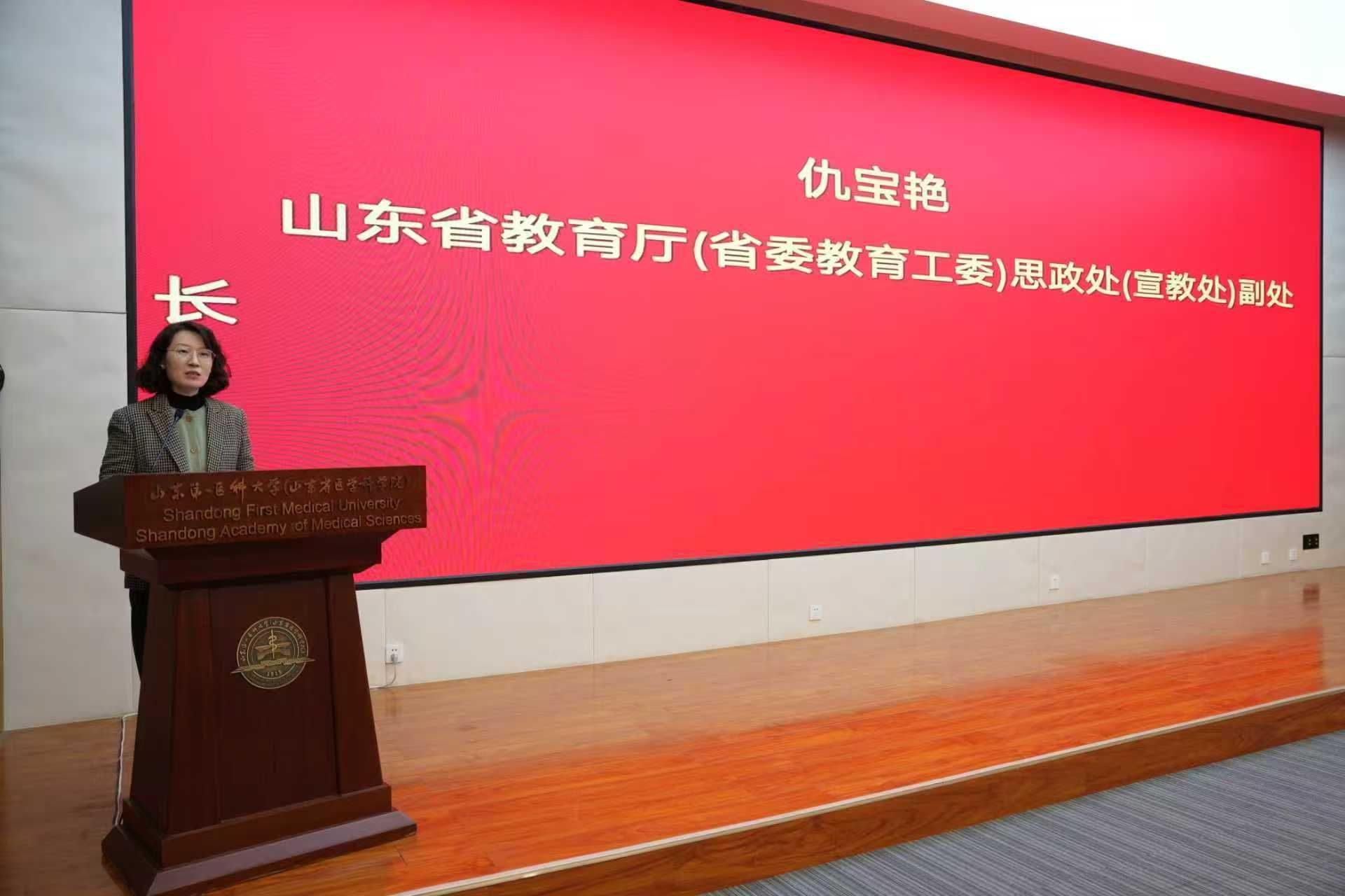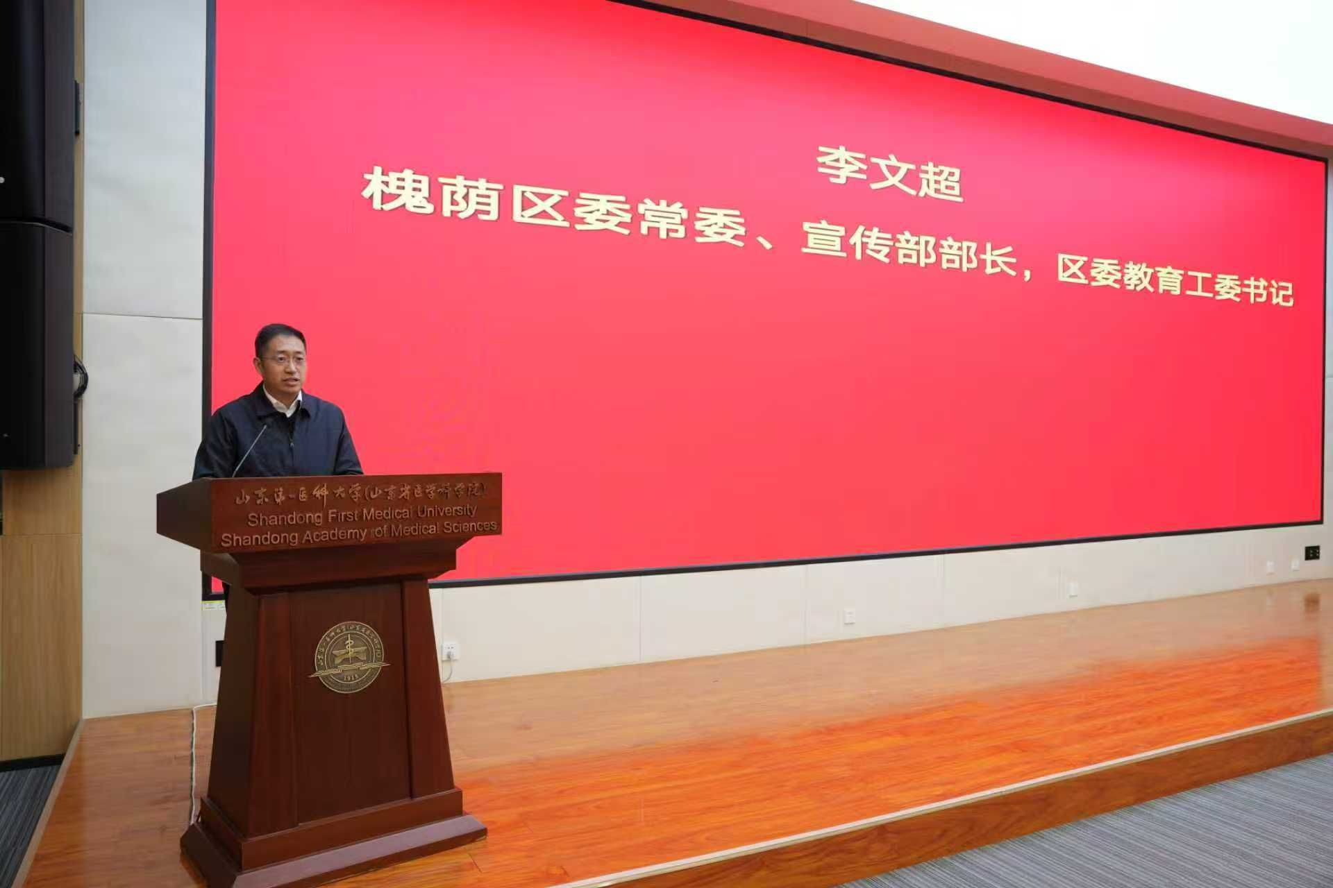 12月16日,“生命守护 医路同行”槐荫区大中小学思政课一体化与健康教育共同体成立仪式暨学习贯彻党的二十届四中全会精神集体备课会在校(院)举行。省教育厅思政处副处长仇宝艳,槐荫区委常委、宣传部部长、区委教育工委书记李文超,校(院)党委委员、副校(院)长贾海宁等出席活动。仪式由校(院)宣传部常务副部长赵遵强主持。