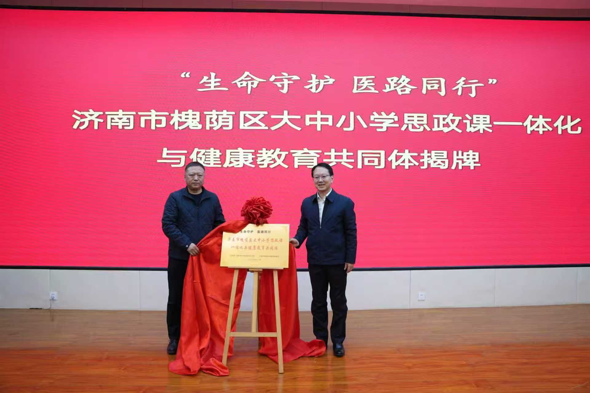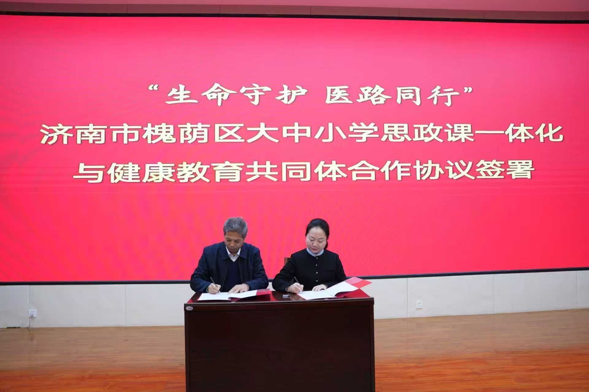 仪式上,贾海宁与槐荫区人大常委会党组成员、副主任肖波为共同体揭牌。校(院)马克思主义学院院长陈士福与槐荫区委教育工委常务副书记、区教体局局长孙莉共同签署《槐荫区大中小学思政课一体化与健康教育共同体合作协议》。