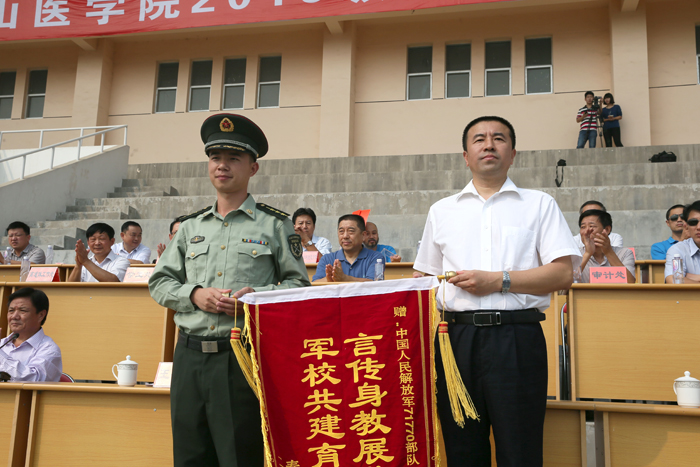表演结束后,彭春雷代表学校向71770部队赠送了锦旗,并宣读了军训优秀教官、先进连队、先进个人和2015级新生奖学金获得者的表彰通报;主席台领导为获奖单位和个人颁了奖。教师代表史卫峰博士、在校生代表张迪、新生代表李名举先后作了发言。