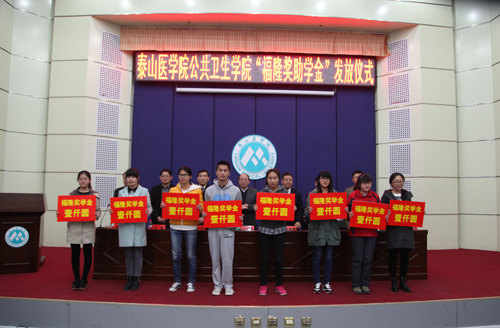 发放仪式上,公共卫生学院负责同志宣读了奖助学金管理实施办法以及首届“福隆奖助学金”获奖者名单。王学春、钱福卿等与会领导为获奖代表颁发了奖助学金。于晓冬同学代表获奖学生对福隆集团的资助表示感谢,并表示会以此作为动力,以更加积极的姿态融入到学习生活中,不断努力,提高自己的能力,以此来回报社会。