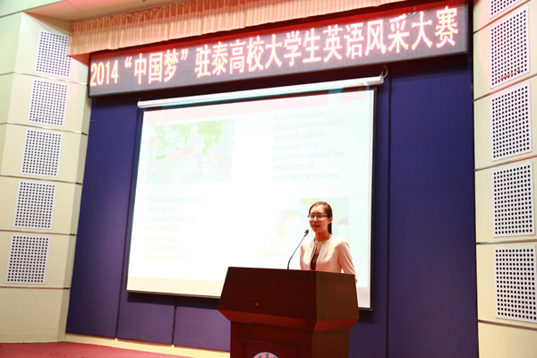 2014年“中国梦”驻泰高校大学生英语风采大赛旨在深入贯彻党的十八大和十八届三中、四中全会精神,践行社会主义核心价值观,在广大同学中弘扬和诠释习近平总书记“中国梦”的理念,使广大学生的人生理想能与“中国梦”紧密结合。经过初赛及复赛的筛选,来自驻泰五所高校的10位选手进入了决赛。驻泰五所高校学子齐聚一堂,用真情演绎四方之志,用实意铺陈携手共进。大赛为大学生提供了展现了活力与风采的舞台,加强了各高校之间的学习与交流,推动驻泰高校校园文化建设。