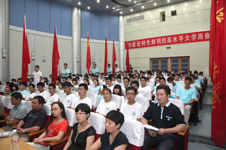 7月11日下午,我校2014年大学生暑期社会实践出征仪式在信息图书楼学术报告厅举行。副院长彭春雷出席活动并为大学生社会实践服务团授旗。出征仪式由校团委书记刘希欣主持。