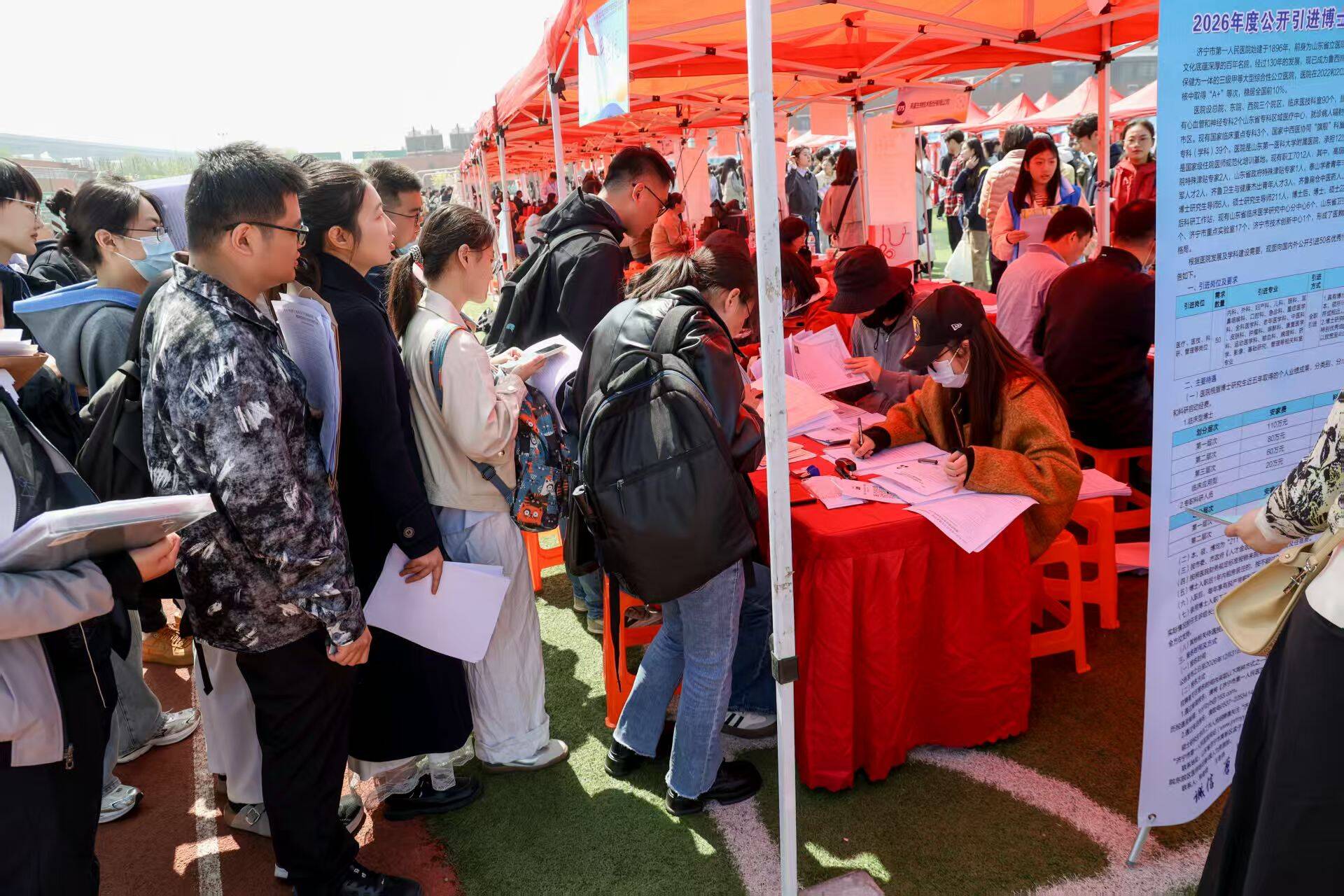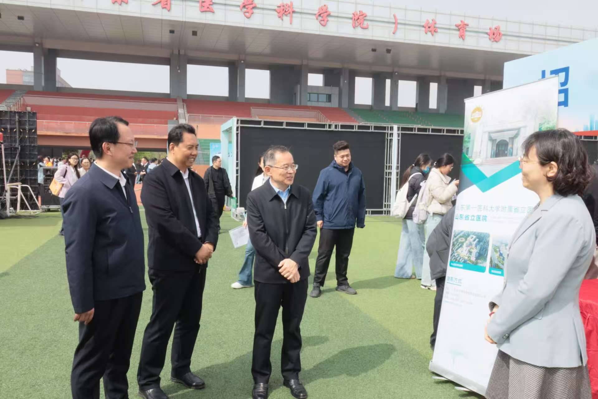 4月10日上午,“选择济南 共赢未来”2026年驻济高校毕业生就业双选会暨山东第一医科大学(山东省医学科学院)2026年春季校园双选会在济南校区体育场举办。本次双选会同步开展直播带岗、AI数智就业、简历诊断等多元服务活动,山东省人力资源和社会保障厅公共就业和人才服务中心就业服务处刘容秀,山东省卫生健康委员会科教处副处长孟勇,济南市人力资源和社会保障局党组成员、市公共就业服务中心主任王振群到场指导工作,校(院)党委副书记王宇轩,党委委员、副校(院)长贾海宁出席活动。