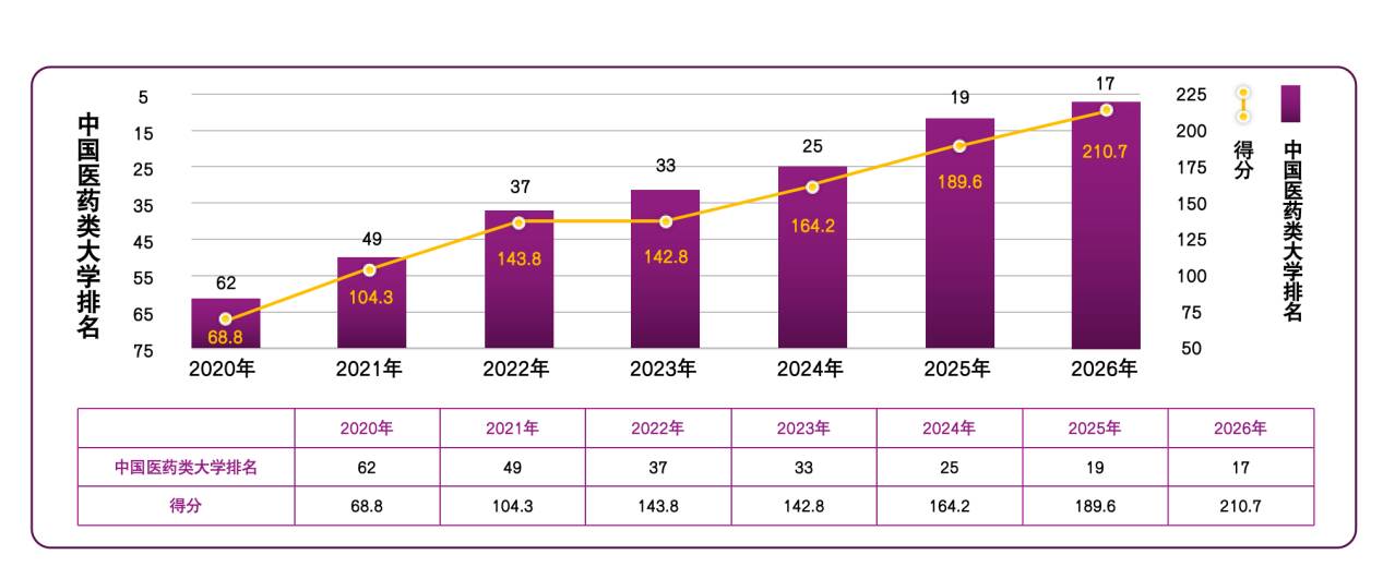 自2020年以来,校(院)已连续六年在软科中国大学排名中保持强劲上升态势,中国医药类排名累计提升45位,全国公办大学排名累计提升271位,充分彰显校(院)坚持教育科技人才一体化发展,创新实施“大学+研究机构+附属医院”一体化育人模式的突出成效。
