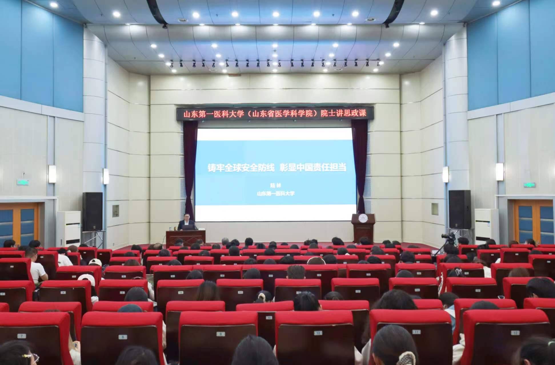 陆林院士以《筑牢全球安全防线 彰显中国责任担当》为题,结合自身担任联合国国际麻醉品管制局委员的履职实践与国际交流经历,立足总体国家安全观,从时代大势、风险挑战、中国方案三个维度,系统解读了全球安全治理与国际药物管控格局,全面介绍了我国在严格履行国际公约、完善药品分类列管制度等方面的务实举措与显著成效。他寄语广大青年学子坚定理想信念、厚植家国情怀、拓宽国际视野,把个人理想融入强国建设与民族复兴伟业,增强国家安全意识与社会责任感,努力成长为兼具专业本领与使命担当的新时代医学青年,为健康中国建设和国家安全稳定贡献青春力量。