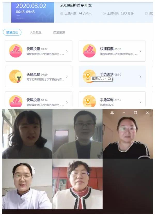 早上8点整,护理学院武江华老师开设的《外科护理学》准时授课,学习的内容是武江华老师录制的“水电解质酸碱失衡病人的护理”,应到学生70人,在线人数74人,校(院)领导们在济南、泰安两个校区,采用“WeLink”会议模式,通过教学平台聆听老师们在线授课,检查各平台线上教学运行情况,对开学第一天教学进行“云督查”。本次检查共抽查3个平台的9门课程,在线课堂上,可以观看老师们发布的本节课学习任务、课程视频内容、课件及在线教材等相关资料,也看到了老师与学生们问答互动情况、关于课程知识点和平台学习使用技巧与感受等讨论情况,整体授课过程流畅,课程学习效果良好。
