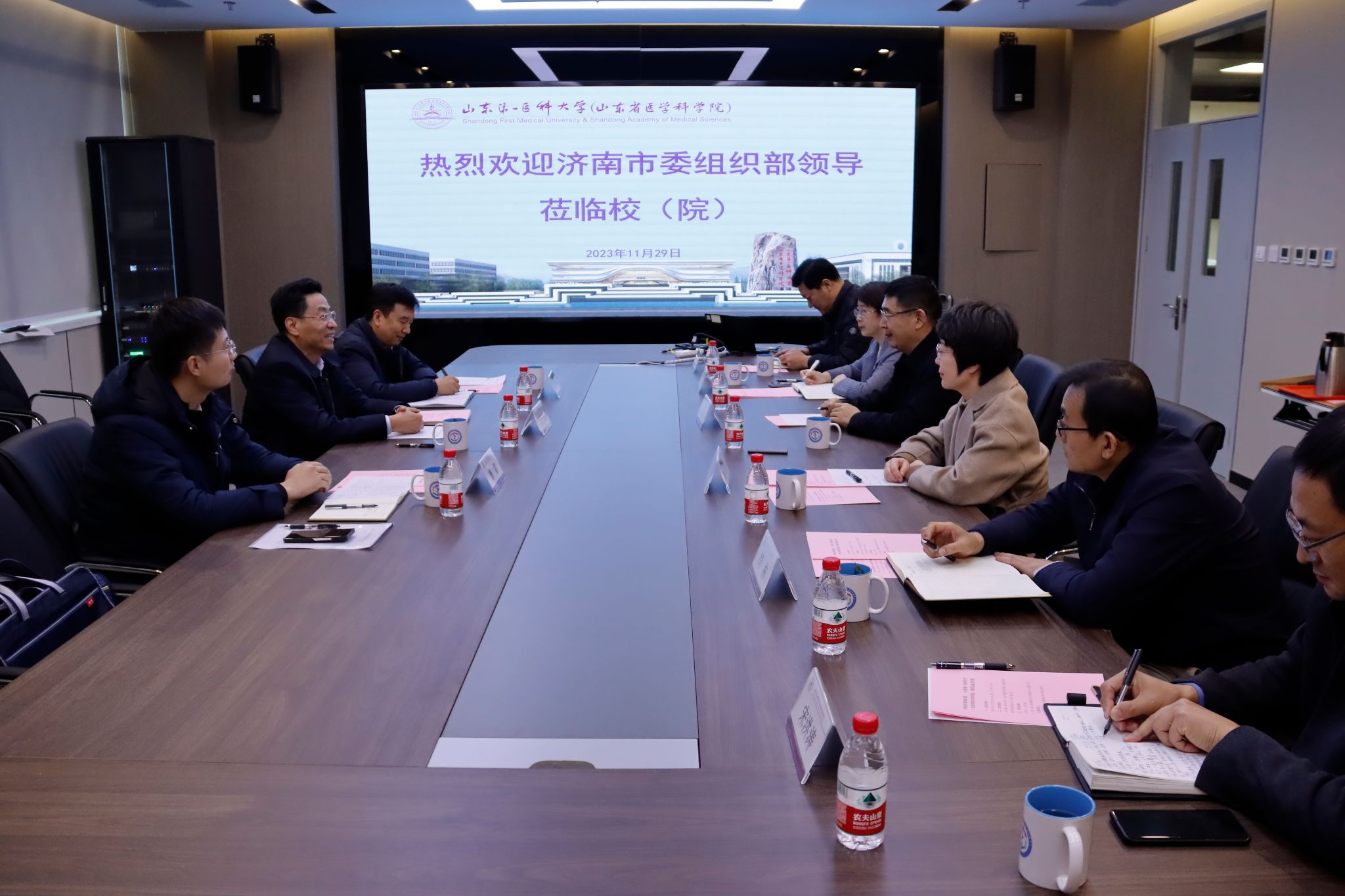 11月29日,济南市委组织部副部长李开森一行到山东第一医科大学(山东省医学科学院)济南主校区调研座谈。校(院)党委副书记刘思金主持座谈会并讲话,校(院)党委委员、组织部部长安琨参加活动。