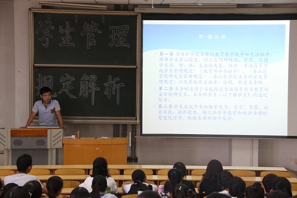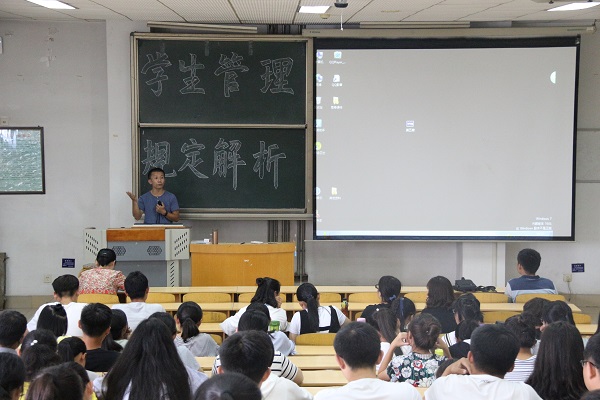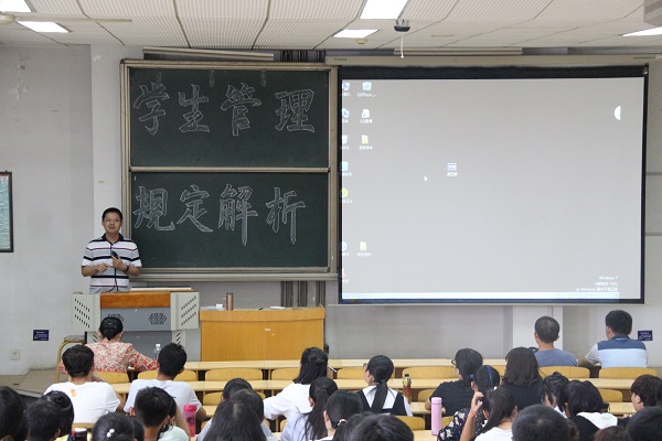 张萌老师则指出学校将在开学三个月之内进行新生身份审核,并就我校平级转专业和降级转专业进行了简单介绍;随后张老师对休学和退学的相关规定作了讲解,指出今年我校将新增一项可因创业休学的规定;最后张老师介绍了学校的奖励与处分政策。