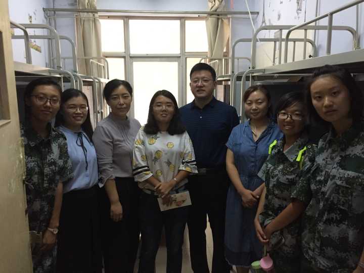 9月16日军训汇演之后,基础医学院党委副书记王鑫、2017级全体辅导员和部分学生代表到玉兰园B108看望张昭同学。