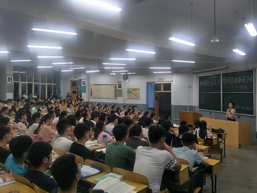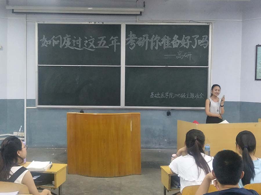 2017年6月26日晚上七点半,在泰山医学院天外村校区二号教学楼2002教室,“如何度过这五年,考验你准备好了吗”主题班会如期召开,本次班会的主讲人是基础医学院2017届毕业生高研同学,基础医学院2015级近三百人听取了主题班会内容。