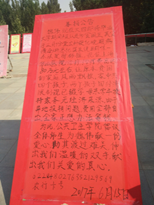 公共卫生学院师生得知此情况后,自发为魏伟同学进行了爱心募捐,并于6月16日在全校范围内组织了为魏伟同学爱心募捐活动,募捐公告一出,全校的师生都纷纷伸出援助的手,为帮助魏伟同学全家渡过难关尽自己的力量做出贡献。此次募捐通过轻松筹募捐、微信募捐、支付宝转账等方式,将善款及时转交到了魏伟手中。