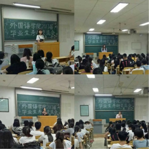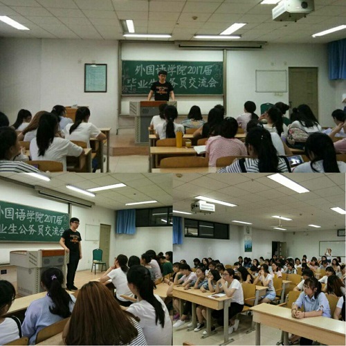 6月3日,外国语学院在教学南楼B座相继举办了2017届毕业生公务员考试和考研两场经验交流会,腾书源、马伊莎、丁曙婷、田筱政等六名优秀毕业生代表结合自己的奋斗经验与大一至大三有意向报考的同学进行了互动交流。