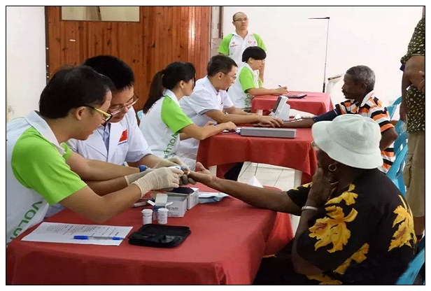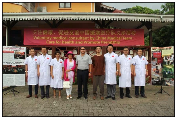 2017年5月20日,第16批中国援塞舌尔医疗队来到塞舌尔普安特?拉儒(Pointe Larue)社区开展大型义诊活动,为当地群众提供无偿医疗服务。驻塞舌尔大使余劲松、该区议员朱德.瓦尔蒙(Jude Valmont)、塞卫生部有关官员及驻塞使馆经商处负责人何方等出席。