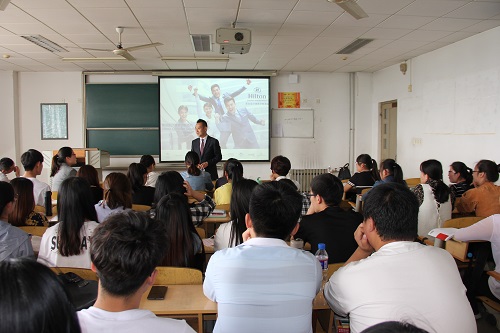 2017年5月10日上午,学校新聘客座教授、青岛金沙滩希尔顿酒店总经理高涛应学院邀请,在教学南楼B5001教室做了一场主题为“树立正确价值观,合理进行人生职业规划”的专题讲座。