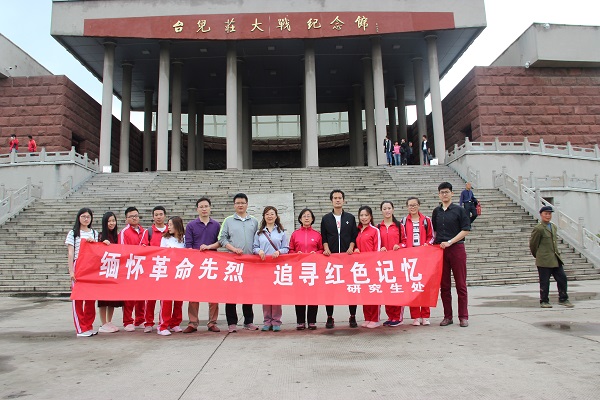 为弘扬爱国主义精神,践行社会主义核心价值观,落实“两学一做”学习教育常态化制度化要求,5月4日,研究生处教工党员、学生党员代表及部分入党积极分子一行,怀着对革命先烈们的崇高敬意,赴台儿庄大战纪念馆参观学习,追寻抗战英雄足迹,缅怀英烈丰功伟绩,铭记中华民族艰苦卓越的抗战史,弘扬自强不息、不屈不挠的抗战精神,接受爱国主义教育洗礼。