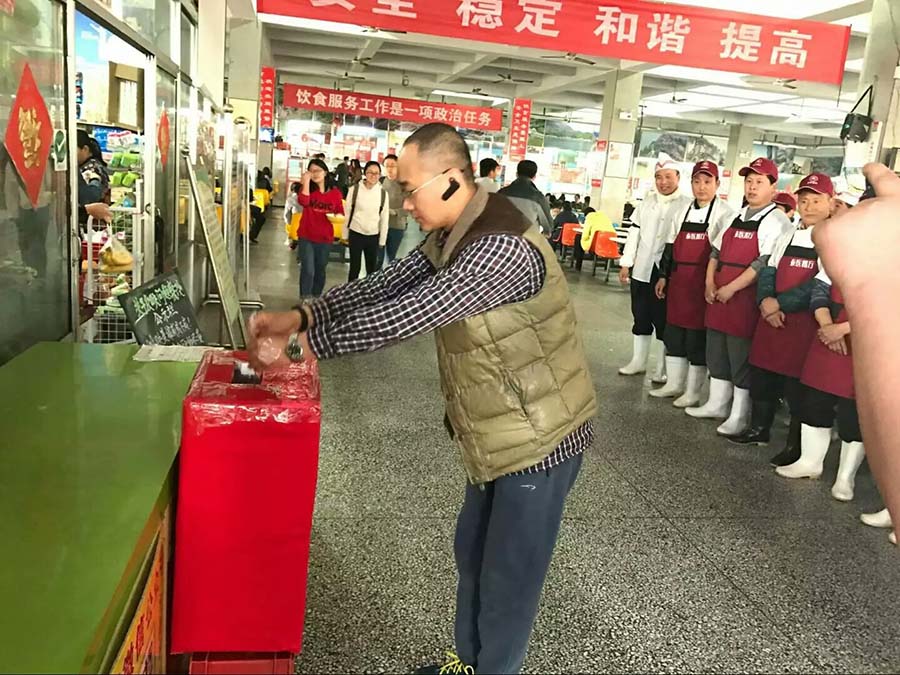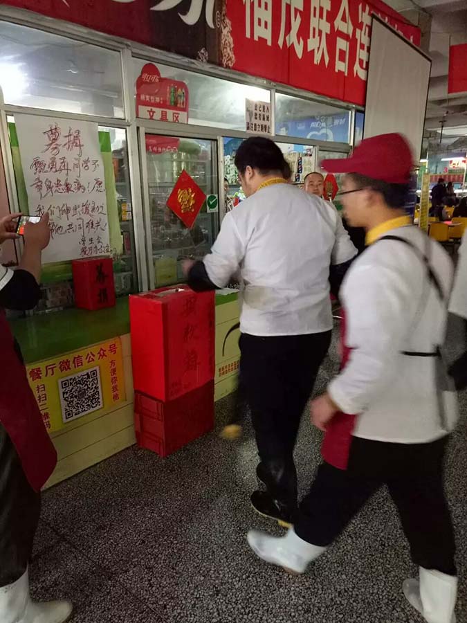 017年4月6日下午,天外村校区食堂得知我院甄勇再同学罹患主动脉血管瘤并形成动脉夹层,后续治疗费用高昂家庭无力承担后,食堂全体员工为甄勇再同学积极募捐,大家积极参与,慷慨解囊,奉献爱心:10元、20元、50元、100元……大爱无形,大音息声,员工们用自己的实际行动表达对同学的关爱。仅仅一下午,募捐款额达1000元。