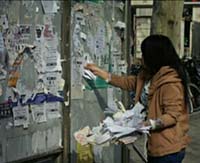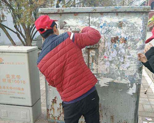 下午4点,同学们拿着事先准备了铲刀、垃圾袋等卫生工具,在活动负责人的带领下,同学们遍布校园的各个角落,仔细地清除校园墙壁上各式各样的小广告。经年累月的小广告覆盖成厚厚的一层,同学们一点一点地铲除、刮净,不怕累,不怕脏,自觉地遵守团队秩序,为美化校园环境尽自己的一份力。