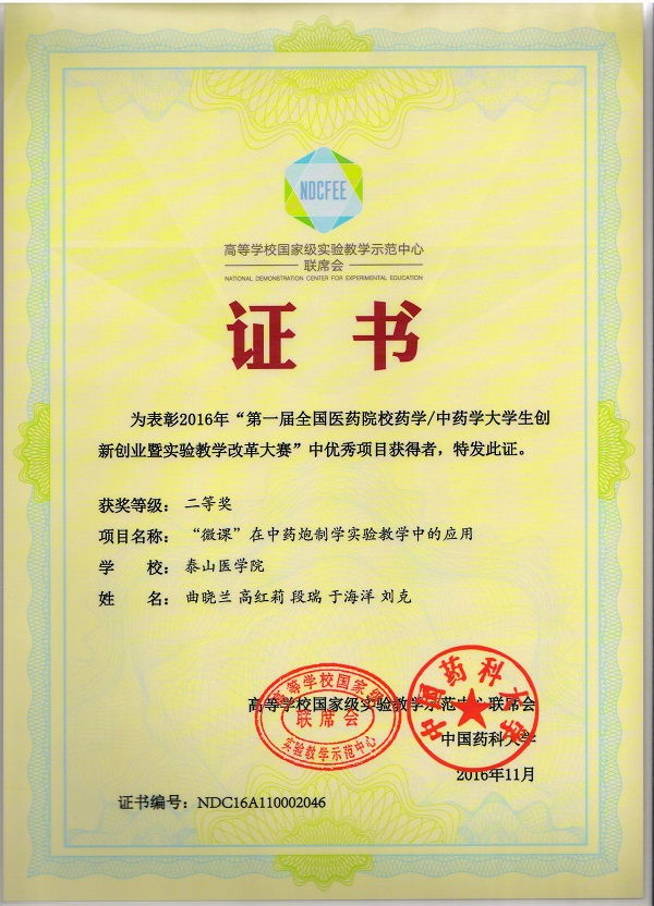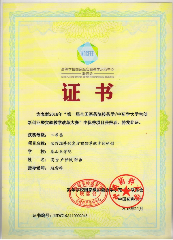 大赛分为学生创新创业组和教师实验教改组。通过专家函评、现场答辩,由赵雪梅老师指导、2013级中药学专业卢梦诚、高晗等同学完成的“治疗湿疹的复方鸭跖草软膏的研制”项目荣获创新创业组二等奖,由曲晓兰等老师完成的“微课在中药炮制学实验教学中的应用”项目荣获实验教学改革组二等奖。