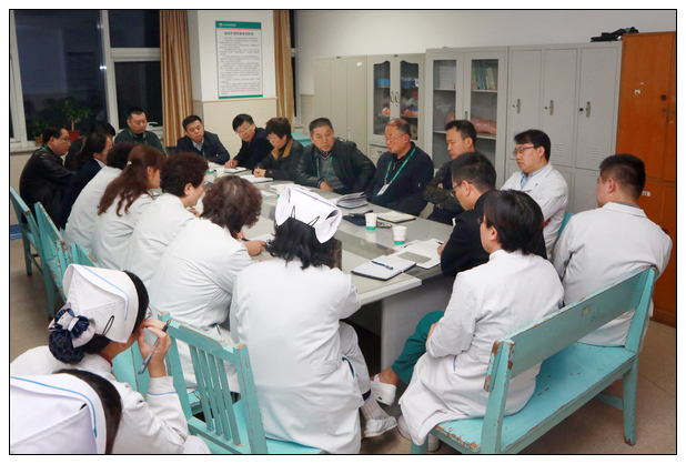 2016年11月1日下午,在家的院领导刘建波、李长勤、贾庆卫、杨晓雯、肖强、王俊勤带领相关职能部门负责同志深入产科病区进行行政查房。产科全体医护人员参加了查房。
