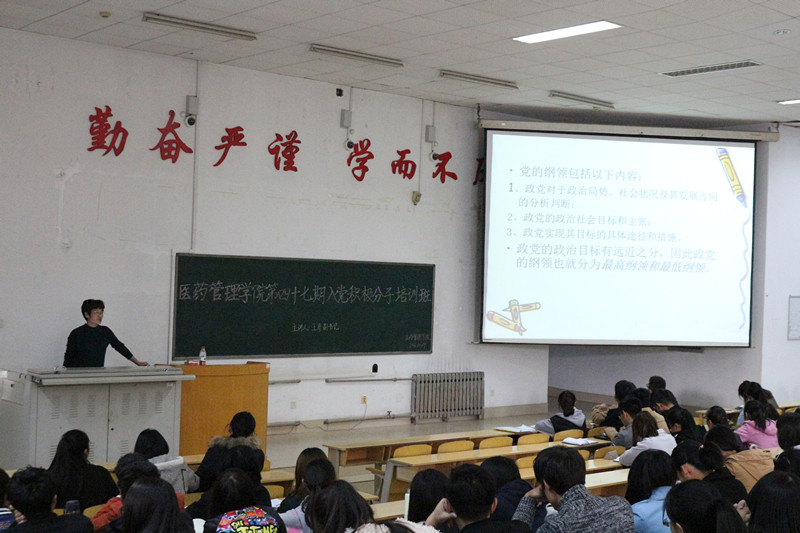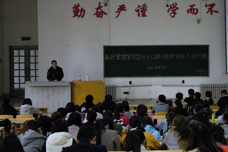 为学习贯彻落实党的十八届六中全会精神,进一步加强基层党组织建设,根据泰山医学院党校的工作安排,医药管理学院党委于10月29日在教学南楼C2024教室举办了第四十七期入党积极分子培训班,对200余名入党积极分子进行了集中培训。学院党委书记张峰、副书记王彦及学生支部书记分别进行授课。