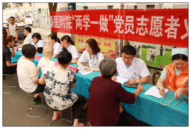 7月21日,由内科党总支、查体中心及南丁格尔志愿护理服务队医护人员组成的党员专家义诊队来到后七里社区,开展了“践行‘两学一做’党员干部进社区”为主题的义诊活动。