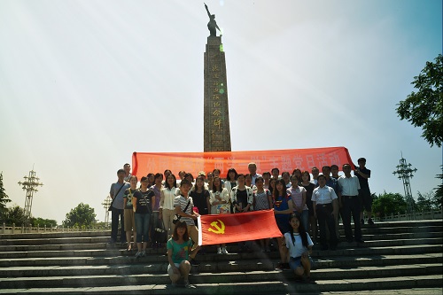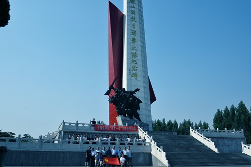 在铁道游击队纪念碑前,外国语学院全体党员重温了入党誓词,并合影留念。参观过程中,怀着对先烈的无比崇敬之情,全体党员同志认真听取了有关铁道游击队的事迹讲解。