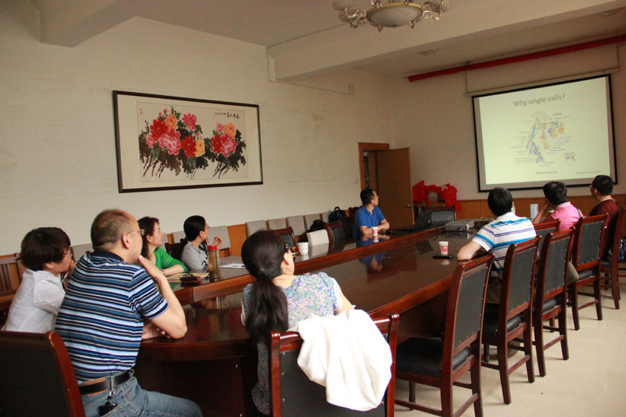 6月3日下午,我校生物化学与分子生物学专业兼职教授、美国马塞诸塞州立大学医学院助理教授杨中法博士为我校师生做了题目为《Dissecting the Heterogeneity of Cells: NGS application on single cell Transcriptome and possibly on Multiple Myeloma》的学术报告。单细胞转录组分析是目前国际上的研究热点,杨博士从单细胞转录组的技术发展、设备改造、成本核算、在血液病方面的临床应用等方面详细介绍了该技术的应用进展,为我校师生在科研设计和转化医学研究方面开阔了视野。随后与其他老师就单细胞转录组方面的合作进行了磋商。