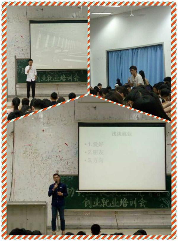 杨成毅以浅谈就业为主题,就坚持爱好、处理人际关系、把握人生方向三个方面给出了自己的见解;张浩然结合自身经历与体验,发表了他对大学生自主创业的看法。形象生动的举例、诙谐幽默的言语,吸引得同学们踊跃参与、积极提问,现场求知氛围良好。