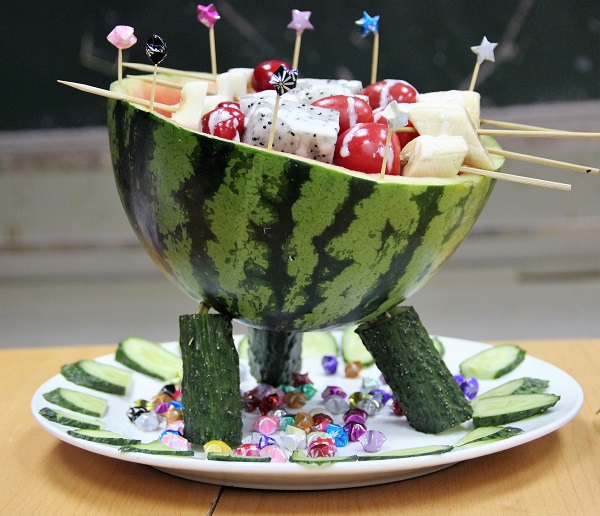 冷拼环节中,同学们充分发挥自己对水果及冷饮的理解,使出浑身懈数,将水果蔬菜变成了别出心裁的夏季清凉菜肴。用黄瓜樱桃等制成的优雅的中国风扇子,用西红柿和黄瓜搭配成的“夏日荷塘”,用西瓜和火龙果等雕成的“水果烧烤”,都冲击着在场每位观众的视觉,另同学们啧啧赞叹。