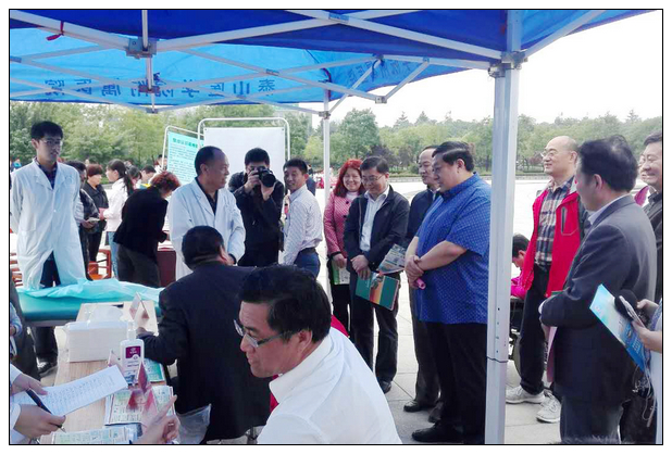 5月15日上午,我院由康复医学科医护人员组成的专家义诊队来到泰山广场,参加了泰安市残联举办的“关爱孤残儿童 让爱洒满人间”为主题的助残日活动。泰安市卫计委党组副书记倪庆斌陪同泰安市政府特邀咨询张庆明看望慰问了现场残疾人士和参与活动的医护人员。