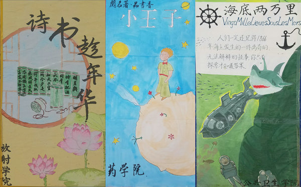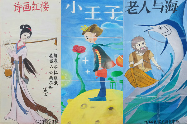 以“阅名著,品书香”主题,各个学院将自己心中的经典作品描绘成一幅幅生动的展板:《麦田里的守望者》色彩温暖,画风柔软,笔触细腻,色彩搭配协调,层次结构明显,完美的表现了“守望者”内心美好梦幻的生活方式;《红楼梦》寓情于景,以黛玉葬花展现了 “一期春尽红颜老,花落人亡两不知” 的红楼诗意;《老人与海》描绘突出了鲨鱼的凶猛和海浪的咆哮,表达了主人公不服输的精神与跟大海搏斗与大自然抗衡的勇气;《小王子》节选小王子与他的玫瑰花,展现了其因为忽略了给玫瑰花浇水而面露的愧疚之色,使得人们仿佛可以透过画卷感受到小王子的悲伤。