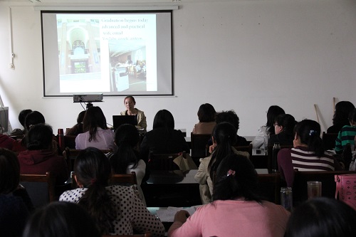 交流会上,科技英语教研室主任薛红和大学英语教研室教师毕银燕分别汇报了在英国考恩垂大学和美国田纳西州立大学访学期间的学习情况。薛老师重点向各位老师讲解了考恩垂大学“英语学术论文写作语料库”的使用,并结合具体事例向大家展示了该校世界一流教授的授课特点、对学生的关注程度及高度的敬业精神。毕银燕老师向大家汇报了她的访学的经历及见闻,特别就该校的课堂授课形式、教师教学方法、中美外语教学差异等问题与在座的老师做了深入交流。