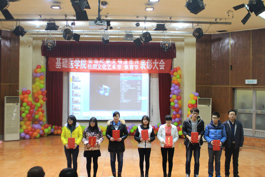 12月10日,在天外村校区视听中心,基础医学院隆重举行安全纪律文明卫生月、社联文化艺术节、体育节表彰大会,表彰在为期一个月的“安全纪律文明卫生月”和社联文化艺术节、体育节中做出突出贡献的个人与集体。基础医学院党委书记高玮、副院长陈玉社、党委副书记王鑫、学生工作办公室主任岳芸出席并为获奖学生代表颁奖,团总支书记张乃强宣读了表彰决定。