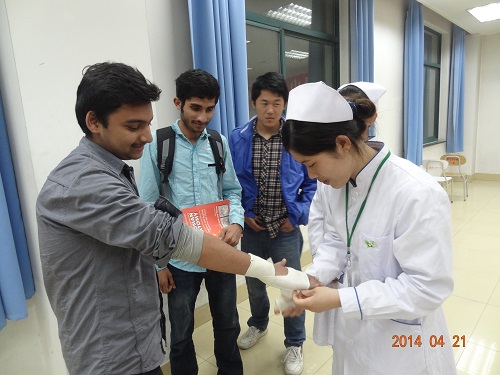 服务队员为留学生演示急救止血包扎技术