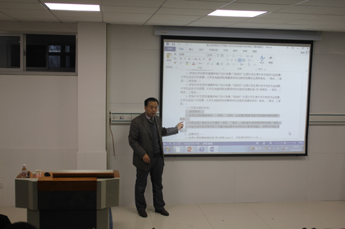 张峰简要介绍了历届“挑战杯”大赛的举办情况,对“挑战杯”大学生课外学术科技作品竞赛和“创青春”大学生创业大赛的作品选题、调查研究、数据筛选、作品定稿等内容进行了详细解读,并结合自身指导学生获奖经历和大家分享了参赛经验。他强调,参赛作品要创意突出、科技含量高、创新性强,要贴近民生和社会热点,要体现当代青年的责任和担当。