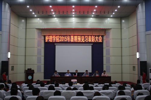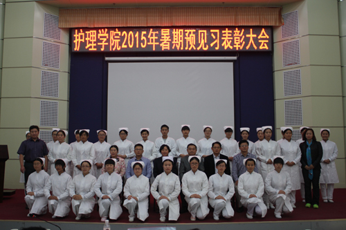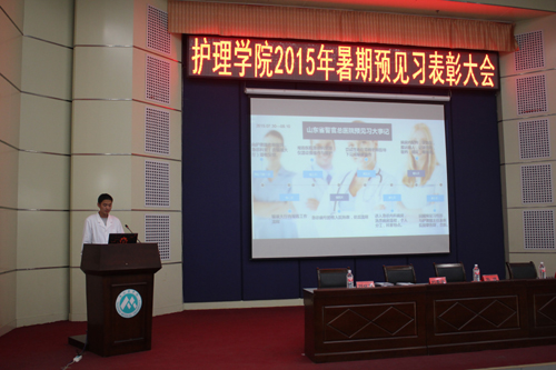 在喜迎泰山医学院高等护理教育办学30周年之际,10月9日下午,护理学院在图书馆报告厅举办了2015年暨第三届暑期预见习总结表彰大会。校学工处处长华波、团委书记刘希欣、实践教学部副主任王目君、护理学院党委书记秦斌、学工办主任王有娟等同志参加了会议。表彰会由护理学院院长刘化侠教授主持。