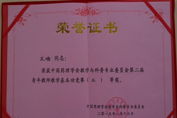 本次会议由中国药理学会教学与科普专业委员会主办。中国药理学会理事长杜冠华教授等多位著名药理学专家出席,并就药理学课程建设及教学改革作了学术报告。我校药学院药理学教研室王浩、陈伟两位老师参加了药理学教学基本功竞赛,并分获三等奖及优秀奖。