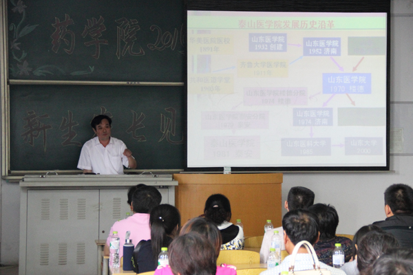 王德才首先对2015级新生及各位家长的到来表示了热烈欢迎。他简单介绍了泰山医学院的发展历史沿革、基本情况和教学单位组成。接下来,他就药学院的组织机构、师资力量、生源情况、学科优势、人才培养方向以及就业、考研形势等方面做了详细的介绍,进一步加深了家长对药学院专业的认知。