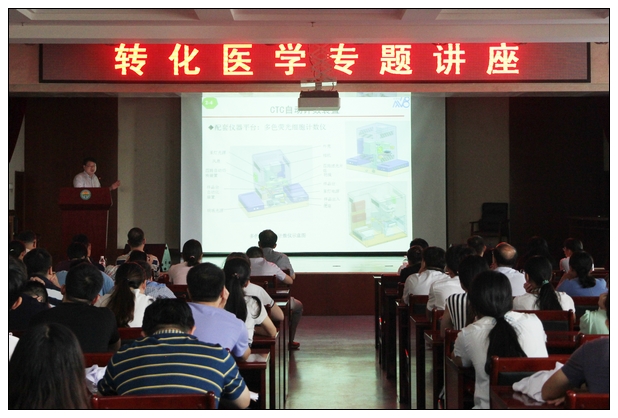 8月14日下午,我校81级校友、上海东方转化医学研究公共平台暨东方转化医学研究中心主任、同济大学附属东方医院魏佑震教授率上海转化医学专家团一行4人来我院进行学术交流。副院长贾庆卫、杨晓雯参加了本次学术活动,我院肿瘤科、检验科等相关科室人员、2015年新入职医师、全体在读研究生300余人聆听了报告。学术报告会由贾庆卫副院长主持。