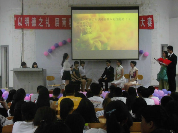 本次比赛共分为三个环节。第一环节礼仪秀,各个学院代表队分别对各种礼仪进行展示,动作优雅,从容大方,赏心悦目。第二环节为知识问答环节,各个代表队开动脑筋,积极答题。第三环节为才艺展示环节,前有洋溢温馨的《你知道的事》,淡淡忧伤的《亲爱的你》,后有清幽高雅的茶艺表演,激情四射的舞蹈《number.9》将比赛推向高潮。整个比赛气氛活跃,精彩纷呈,优雅的礼仪,轻柔的音乐,高雅的茶艺,幽默的主持,令大家印象深刻。