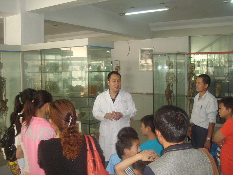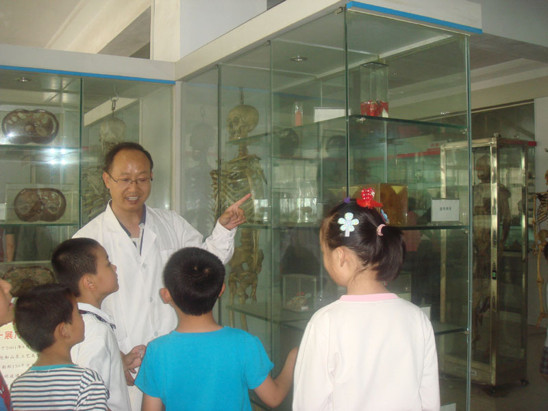 在解剖学实验室,顿爱社、孙丰刚老师分别带领两个小学的40名优秀学生及家长、老师参观了始建于2001年的人体标本陈列室。首先对大家进行人文教育,要求尊重遗体捐献者,尊重技术人员的劳动,心怀崇敬之心,爱护标本。然后带领大家依次参观了运动系统、内脏学、脉管学、神经系统的人体标本。结合骨折、颈椎病、腰椎间盘突出等临床常见病,针对小学生的年龄特点,用通俗易懂的语言进行了深入浅出的讲解及科普宣传,使大家了解人体基本构造及常见疾病的预防,向大家普及了医学知识,激发了同学们的学医兴趣。