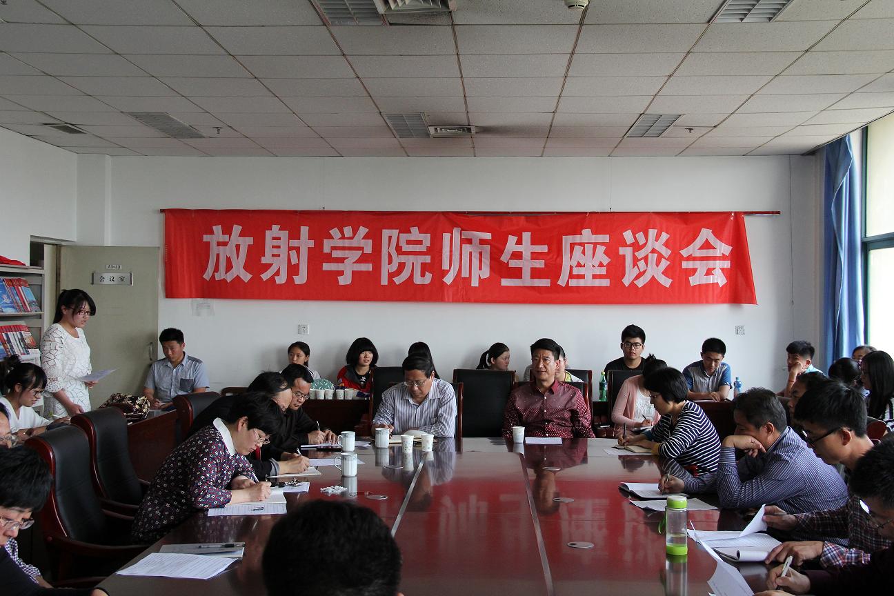 为了深入了解学生的学习和生活情况,进一步加强师生间的沟通与交流,放射学院于2015年5月13日在放射楼三楼会议室召开了师生座谈会。党总支书记孟庆建、副书记翟承强、副院长王晓艳、副院长冯圣平、各教研室实验室主任及各专业各年级学生代表参加了此次座谈会,会议由副院长王晓艳主持。