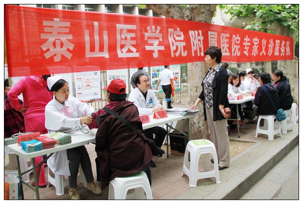 5月8日上午,我院专家义诊队在副院长杨晓雯带领下来到泰安市青年路,参加了主题为“践行基本原则——纪念红十字和红新月运动基本原则通过50周年”的宣传义诊活动。
