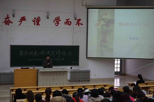 毕教授首先结合自身教学实践经验和研究成果向同学们阐释了公文的释义、公文写作注意事项和事务公文写作注意事项;又分别讲述了法定公文写作和规范公文写作的行文规则;并对公文的格式、写作规范、内容条理化、语言平实简明等要求进行了详尽的说明。最后毕教授运用现实生活中的一些例子生动形象的将各种公文写作技巧呈现在大家面前,在大家阵阵掌声中,论文写作技巧讲座圆满结束。