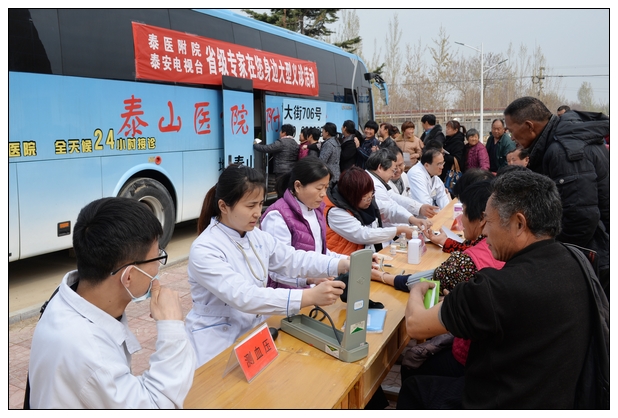 4月9日上午,由我院和泰安电视台联合开展的“省级专家在您身边”义诊活动在肥城市仪阳镇石坞社区拉开帷幕。此次义诊医疗队由手外科、内分泌科、神经内科、泌尿外科、医学影像科、眼科、口腔科、超声科、查体中心等8名专家、5名南丁格尔志愿者和1名大学生志愿者组成。义诊期间,医疗队深入社区,为当地群众义诊送健康。在一上午时间里,医护人员认真为群众义诊、查体,耐心解答他们的健康问题,共服务村民近200名,开出健康处方150余张,心电图检查150余人次,发放院报、健康宣教材料300余份。义诊活动受到当地群众的一致欢迎和好评。泰安电视台进行了全程跟踪采访报道。