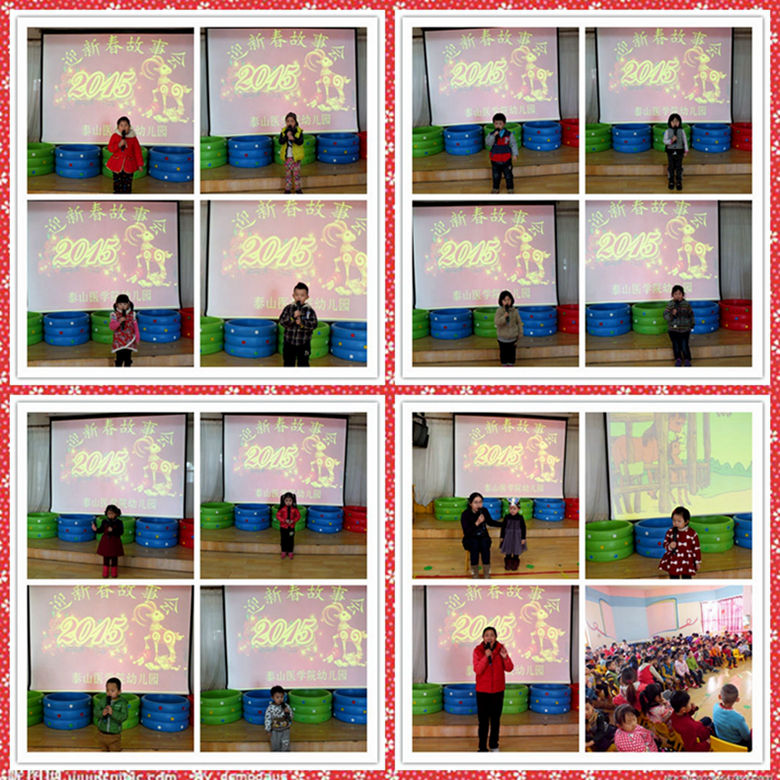 2015年2月4日上午,天外村校区幼儿园举行“迎新春故事会”演讲活动,各班推选出的二十余名班级“故事大王”及教师代表,为全园师生奉献了丰盛的故事大餐。他们通过流利的语言、丰富的表情及肢体动作,演绎了一个个脍炙人口的动人故事。本次活动展示了幼儿的语言表达能力,锻炼了幼儿认真倾听、大胆表述等能力,是对我园语言教育的一次检验,收到了良好的效果。