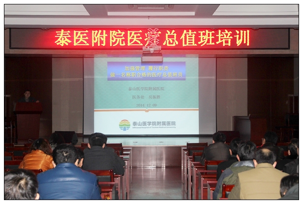 自3月份我院实行医疗总值班制度已历时8个月,医疗总值班人员履行职责,认真巡查病房,积极协助处理疑难危重病人、多发伤、复合伤病人及突发事件,在保障医疗安全方面发挥了重要作用。为了进一步加强医疗总值班管理,规范值班行为,提高总值班人员对突发、复杂事件的处理能力,12月9日下午,我院组织医疗总值班人员进行第二次培训,来自各个科室的医疗总值班参加培训,副院长杨晓雯到会讲话。医务处主任房振胜作培训讲座。